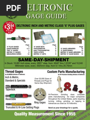 Standard steel black guard gages vermont gage stocks class zz gages in both steel and black guard. The deltronic gage guide is a thorough reference on our in stock 10 081 inch size english plug gages. Most deltronic plug gages and alameda thread gages are available for same day shipment from inventory. Deltronic has originated so many unique and valuable features in its plug gages that it was granted patent number 2 715 281 by the united states patent office.